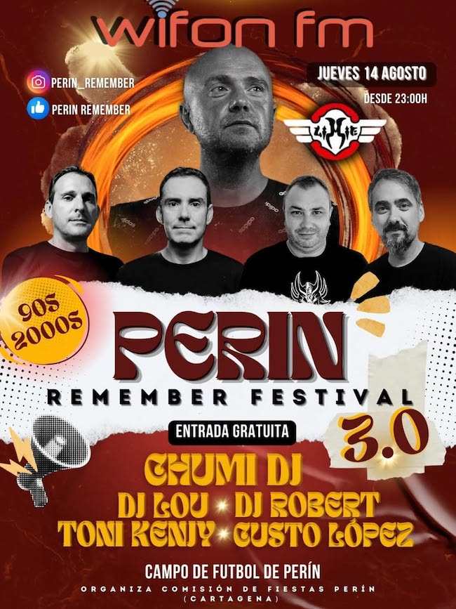 Por otro lado, pero también dentro del oeste cartagenero, indicar que ya hay cartel para el festival 'Perín Remember' que tendrá lugar en el campo de fútbol el 14 de agosto organizado por la comisión de fiesta. Entrada gratuita.