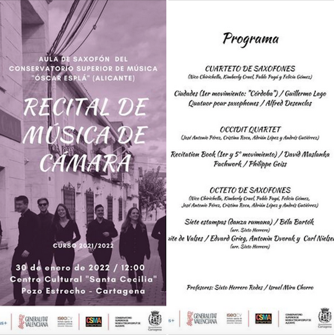 Leer más...El alumnado de saxofón del conservatorio superior 'Óscar Esplá' de Alicante ofrece hoy, a las 12 horas, una actuación en la sede de la Sociedad Artístico Musical Santa Cecilia.