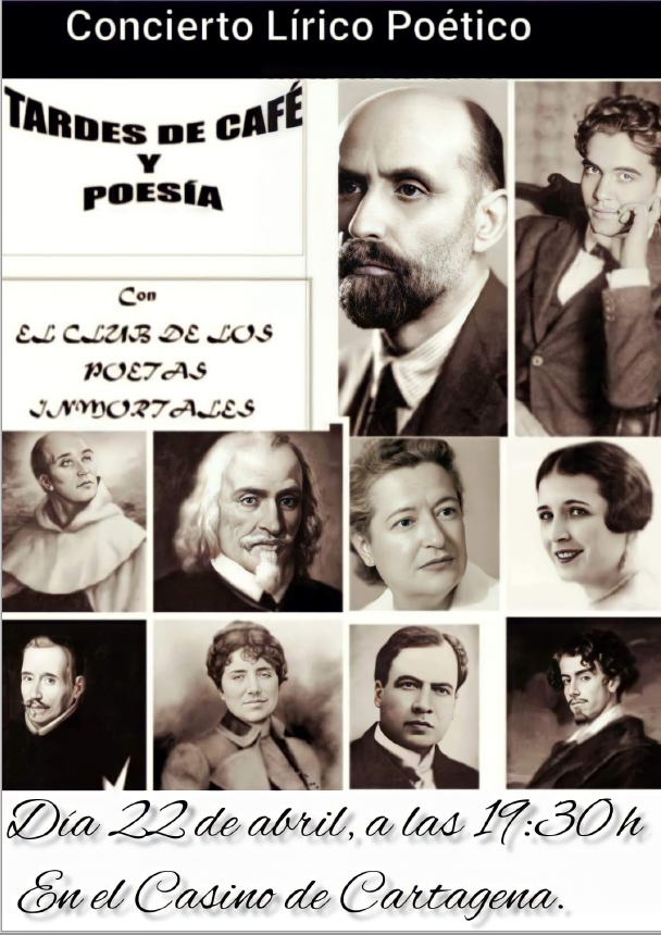 El Club de los Poetas Inmortales, organiza este viernes 22 de abril, un concierto lírico poético. El evento tendrá lugar en el Casino de Cartagena a las 19:30 horas. La entrada será libre y gratuita hasta completar el aforo del local.