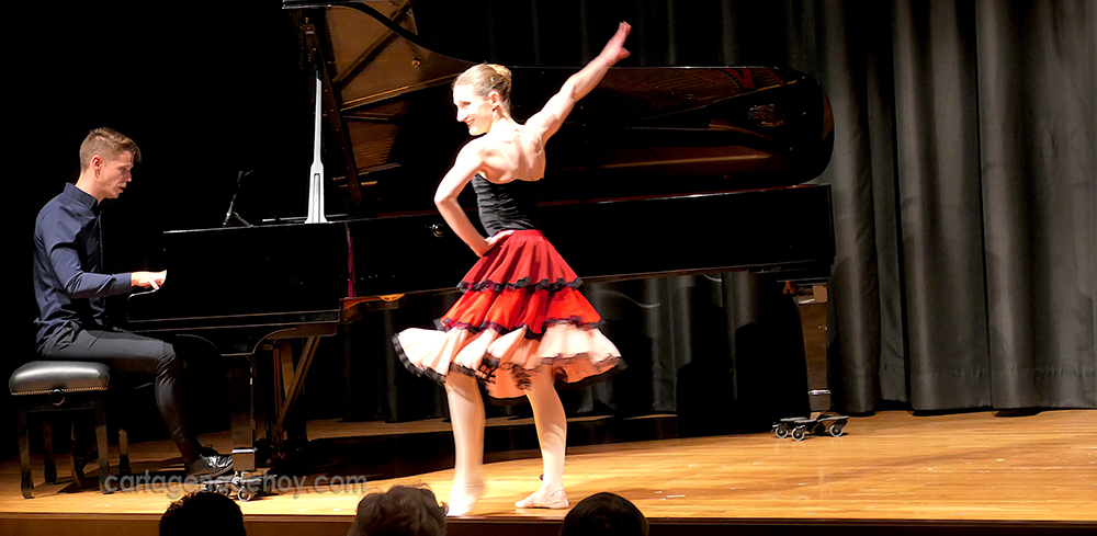 El espectáculo sobre el escenario del aula de cultura 'Antonio Ramos Carratalá' de la calle Mayor de Cartagena fue ofrecido por José Vicente Riquelme Ros, en el piano, y lena Molina Llopis, con la danza, dentro de una actuación encuadrada en un concierto de música clásica espñaola en homenaje al bailarín Félix García.