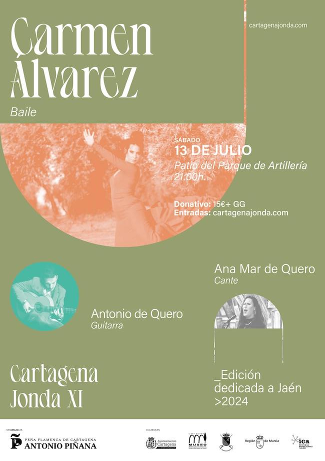 Entradas: www.cartagenajonda.comCarmen Álvarez (Arjona, 1994). Esta bailaora flamenca se abre hueco en los escenarios del país, al tiempo que vuelca su carrera en la vertiente pedagógica de la danza, campo en el que da salida a su vocación y reto de transmitir. Antes de eso, se había trasladado a Córdoba, donde estudió Enseñanzas Profesionales de Danza. Acumula experiencia en el prestigioso Centro de Arte Flamenco y Danza Española Amor de Dios de Madrid, donde imparte clases. Con su espectáculo Jerga (estrenado 2022) celebra la contribución histórica de su provincia al mundo del flamenco. Remate, Rastra, Verdeo, Envero, Prensa y Trasiego son las paradas de este viaje por el Olivar.