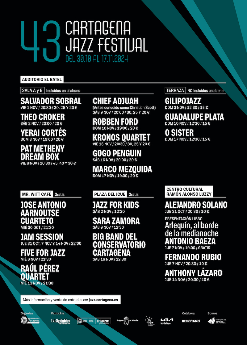 La 43 edición del Cartagena Jazz Festival será una de las más extensas de su historia, y es que 23 conciertos forman parte de una programación que este año se extenderá entre El Batel, el café Mr. Witt, el Centro Cultural Ramón Alonso Luzzy y la plaza del Icue. A los artistas ya anunciados entre los que se encontraba Pat Metheny, Gogopenguin o Salvador Sobral, el Ayuntamiento de Cartagena, organizador del evento ha dado a conocer el programa completo de un festival que suma entre otros a Anthony Lazaro, Alejandro Solano, Fernando Rubio o Sara Zamora. Toda la programación y venta de entradas en jazzcartagena.es Los abonos ya están agotados. José Antonio Aarnoutse Cuarteto, Five for jazz y Raúl Pérez Quartet serán las formaciones que este año actuarán en la programación del festival en Café Mr. Witt. Los conciertos serán los miércoles 30 de octubre, 6 y 13 de noviembre. Gratuitos, hasta completar aforo. Los tres comenzarán a las 21:30 horas.