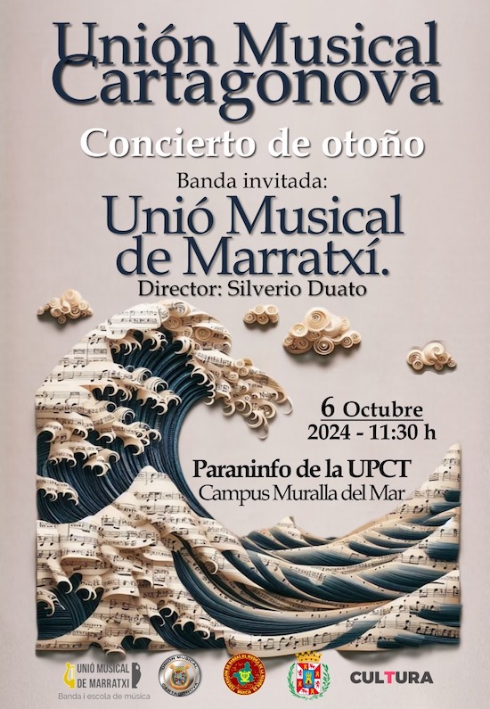 La Unión Musical Cartagonova organiza este domingo el 'Concierto de otoño' en el Paraninfo de la Universidad Politécnica, donde estará como invitada la Unió Musical de Marratxí (Mallorca). Después, a final de mes, la banda que dirige Jaime Belda actuará en el auditorio Víctor Villegas de Murcia y en diciembre lo hará en El Batel.