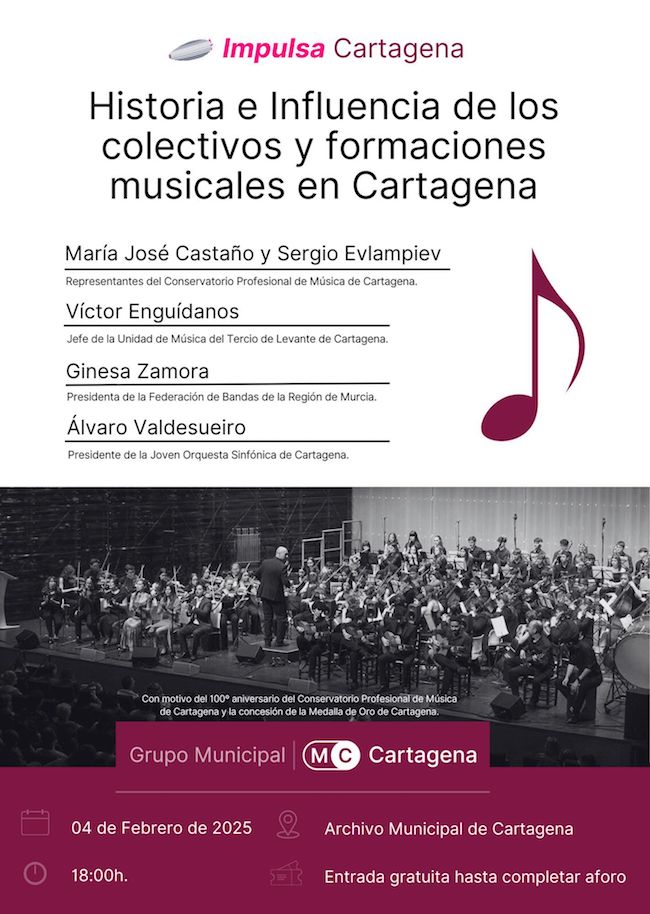 El Archivo Municipal acoge esta tarde una nueva jornada de 'Impulsa Cartagena', que organiza MC, que abordará la historia e influencia de los colectivos y formaciones musicales locales con participación de María José Castaño, Sergio Evlampiev, Víctor Enguídanos, Ginesa Zamora y Álvaro Valdesueiro.