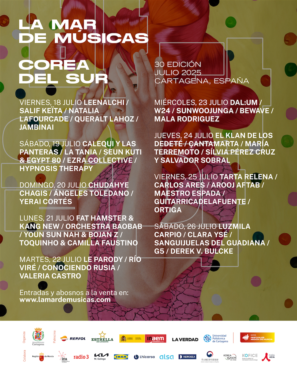 Este Especial Corea del Sur mostrará en esta ciudad del sureste español la amplitud musical del país asiatico, con grupos que van desde el K-pop, posiblemente el estilo más de moda en los jóvenes de todo el mundo, con W24 y Bewave, y formaciones que están liderando una nueva era de la música coreana, combinando lo tradicional con lo contemporáneo, como Jambinai, Leenalchi, Dal:um y Chudahye Chagis. Se sumarán a esta muestra de música coreana la gran diva del jazz Youn Sun Nah, una de las figuras más destacadas de la escena independiente, Sunwoojunga, y los sonidos electrónicos de Hypnosis Therapy y Fat Hamster & Kang New. Tras la programación coreana, la presencia de artistas y bandas de nuestro país tiene un peso muy importante en esta 30 edición. España está viviendo un momento en lo musical muy en sintonía con lo que La Mar de Músicas ha ido reflejando a lo largo de su historia: las músicas donde la raíz, el folclore y la tierra se escuchan. Este movimiento musical, cada vez más importante en nuestro país, tiene en este festival su gran aliado.