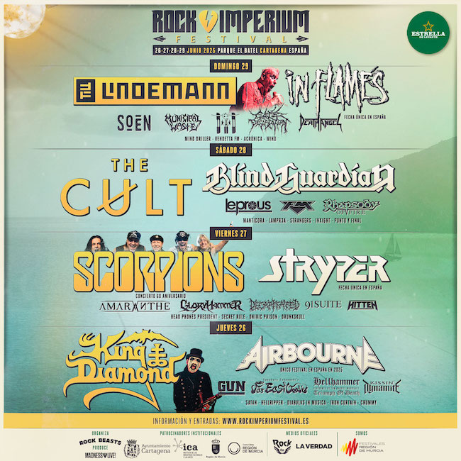 El Festival Rock Imperium de Cartagena desvela los horarios de los conciertos para la edición de 2025, que se celebrará del 26 al 29 de junio en el recinto situado en la Cuesta del Batel. Artistas internacionales como Scorpions, Till Lindemann, King Diamond, The Cult, Blind Guardian, In Flames, Stryper o Airbourne actuarán en el certamen, que cuenta con el patrocinio del Ayuntamiento. El cartel con los horarios detallados está disponible adjunto a esta noticia y en la web www.rockimperiumfestival.es