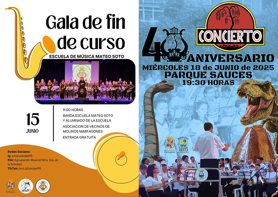 La banda escuela de Molinos Marfagones ofrecerá un concierto el domingo próximo por la mañana en el local de la asociación de vecinos, mientras que la agrupación musical llevará a cabo el miércoles 18 la actuación de su cuarenta aniversario entre los dinosaurios del parque de la barriada urbana donde tiene su sede.