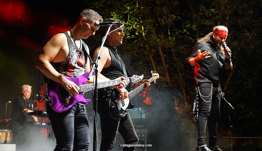 La gran jornada musical nocturna que tuvo lugar en la plaza de los Reyes Católicos tuvo dos capítulos, siendo el primero protagonizado por 'Sharabia', una banda cartagenera que arrastra seguidores por donde actúa, como se pudo comprobar dentro de la multitud que acudió a Vista Alegre, la mayoría atraídos por 'Mojios Escozíos', pero que enseguida se vieron 'enganchados' al ritmo rockero del grupo que lidera, como vocalista, Juan Arroyo 'Chiqui', que ofreció temas propios con otros versionados (siempre en español) de bandas como 'Medina Azahara' y 'Scorpions' que se han convertido en estandartes de sus actuaciones.