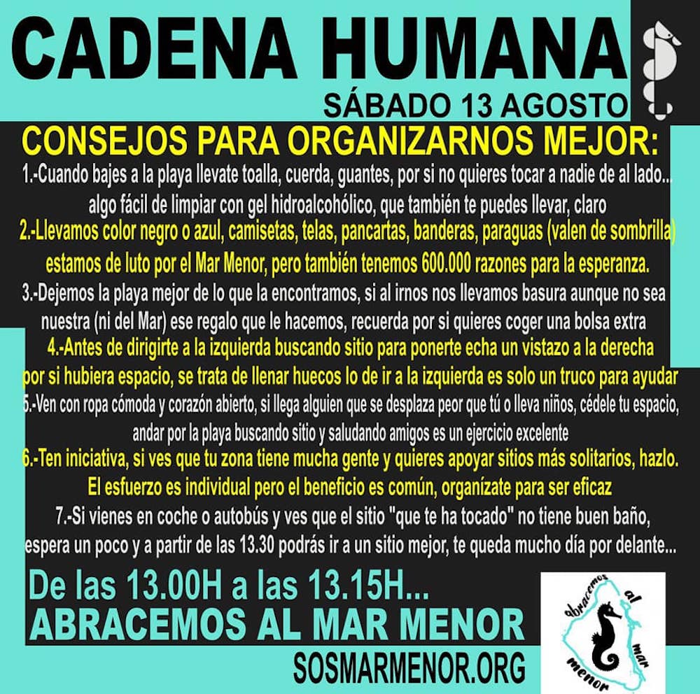 Queda un mes para el segundo gran abrazo al Mar Menor, pues será el 13 de agosto, a partir de las 13 horas, será cuando se lleve a cabo la gran cadena humana para mantener la exigencia a los políticos de soluciones para el Mar Menor. Los organizadores dan una serie de consejos para ese día. Sin embargo, en la jornada de hoy el foco de atención es que se vota en el Congreso de los Diputados la ponencia de la ILP. Teresa Vicente anunció anoche, durante la gala de los 'Premios de Onda Cero', que todos los partidos la respaldarán, con lo qu la iniciativa legislativa popular seguirá de forma firme su camino tras llegar a las instituciones con el respaldo de más de seiscientas mil firmas presenciales de vecinos.