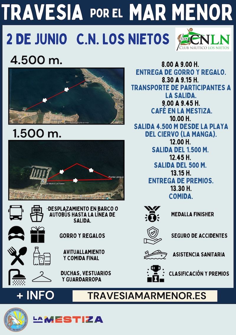 Organizada por el Club Náutico de Los Nietos, comenzará a las diez de la mañana y tendrá dos distancias para los participantes (4.500 y 1.500 metros). La prueba no sólo reúne a nadadores de todos los niveles para disfrutar de las aguas del Mar Menor, sino que también tiene un enfoque reivindicativo.