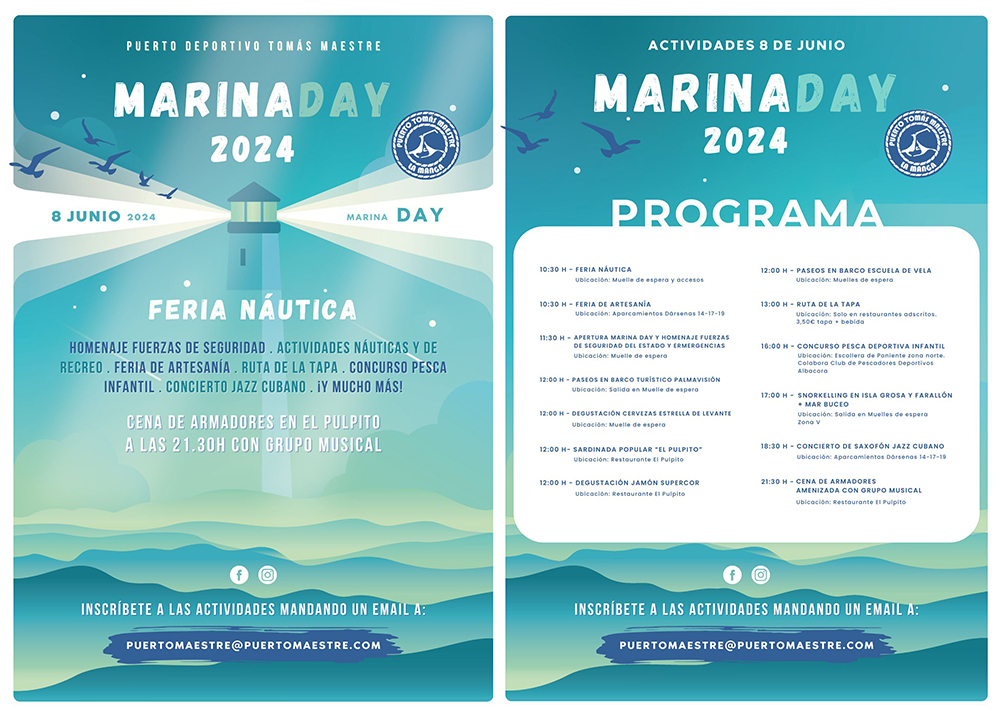 El próximo sábado 8 de junio tendrá lugar el Marina Day 2024, organizado por el Puerto Tomás Maestre, en La Manga del Mar Menor. Una jornada de puertas abiertas, en la que familias, amigos y amantes del mar y la navegación, se reúnen para disfrutar de multitud de actividades náuticas, culturales y gastronómicas.