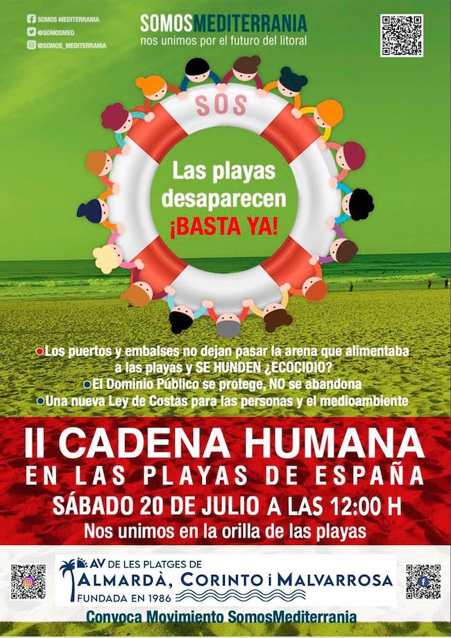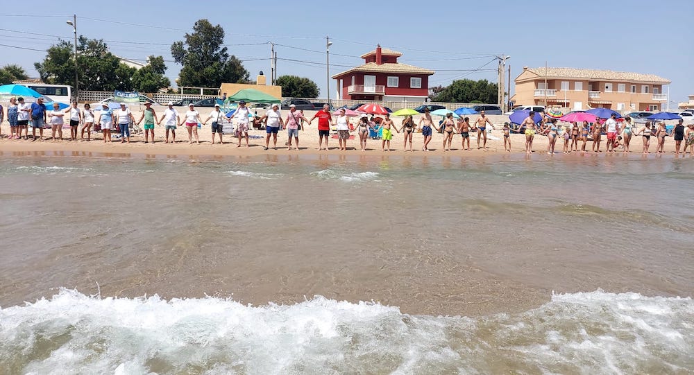 A las doce del mediodía de hoy sábado, más de un millar de personas han participado en cadenas humanas realizadas en las playas de Levante (Cabo de Palos), del Paseo (Los Nietos), playas de Bahía y Nares (Mazarrón) y en la playa de Puntas de Calnegre (Lorca), para pedir protección ante la vigente Ley de Costas. También se han llevado a cabo cadenas humanas conformadas por miles de personas en decenas de playas de la costa española.
