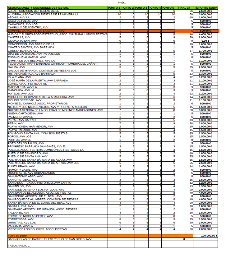 A raíz de esta noticias, fechas más tarde, residentes de este complejo contactaban con este diario para indicar que la Asociación de Vecinos Camping Villas Caravaning La Manga tenía concedida una ayuda del Ayuntamiento de Cartagena, aportando el cuadro con reparto de subvenciones públicas de este año para las fiestas: