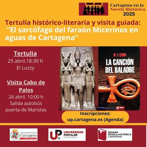 La Universidad Popular de Cartagena y la asociación de la Semana de la Novela Histórica del municipio programan una tertulia histórico - literaria sobre la figura del faraón egipcio Micerinos y sobre el naufragio por el que, siglos después, su sarcófago acabó depositado en las costas de Cabo de Palos. De esta manera, la actividad también incluye una visita guiada por Cabo de Palos. La actividad se realizará los días 25 y 26 de abril, y los interesados pueden inscribirse gratuitamente a partir de este martes 15 de abril en la web www.up.cartagena.es. Hay 40 plazas disponibles.La iniciativa se divide en dos jornadas, ya que el 25 de abril, a partir de las 18:30 horas, se realizará la tertulia en el Centro Cultural Ramón Alonso Luzzy. Esta contará con las ponencias de Javier Sánchez Páramo, profesor de la Universidad Popular y del grado de Historia del Arte en la UNED, quien bordará el contenido histórico, centrado en la figura del faraón egipcio en su contexto histórico y del naufragio. También participará como ponente María Pilar Conn, escritora e ilustradora, autora La Canción del Baladre, centrada en la zona de Cartagena y su Comarca.