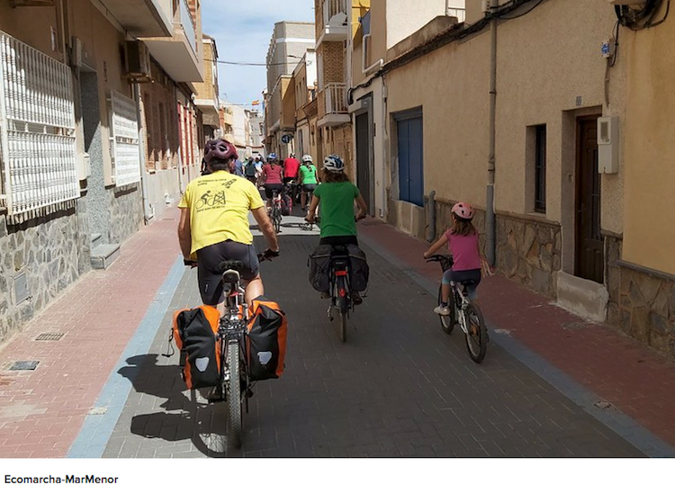 El sábado 19 de abril concluyó en Murcia la 2ª edición de la Ecomarcha Primavera, una ruta ciclo-ecologista organizada por Ecologistas en Acción que aúna la promoción de la bicicleta con las reivindicaciones ecosociales. A lo largo de una semana, un pelotón de 120 personas de edades y procedencias diversas ha recorrido cerca de 300 kilómetros, iniciando su andadura en Murcia, atravesando la huerta para acercarse a Sierra Espuña, y pasando por la costa de Mazarrón y Cartagena, para descubrir Portmán y, por fin, el Mar Menor. La marcha finalizó de nuevo en Murcia, con una cena de cierre en la que se sirvieron platos típicos de la gastronomía murciana.