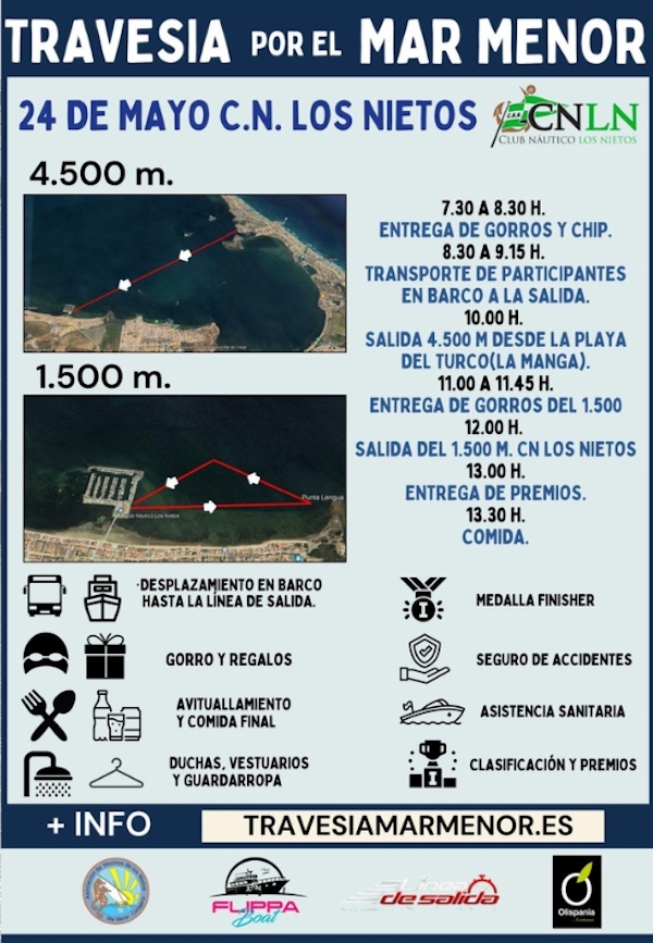 El Mar Menor acoge este sábado 24 de mayo la II Travesía de Natación en Aguas Abiertas con más de 200 nadadores. Tiene salida en el Club Náutico Dos Mares de La Manga sobre las 10 horas y llegada en el Club Náutico de Los Nietos, a partir de las 11 horas. A las 12 horas saldrán de Los Nietos los nadadores de la prueba corta. Y a las 13 horas será la entrega de premios en Los Nietos. El recorrido presenta dos distancias adaptadas a diferentes niveles: 4.500 metros, con salida desde C.N. Dos Mares y llegada al Club Náutico Los Nietos. 1.500 metros, con salida y meta en el propio Club Náutico Los Nietos.