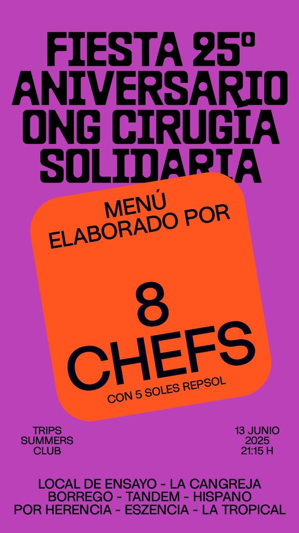 La acción médico-humanitaria cumple su 25 aniversario y lo celebrará el próximo viernes 13 de junio con una gran fiesta solidaria en Trips Summer Club, en La Manga, con música en directo, sesiones de djs y un menú gastronómico elaborado por diez chefs con soles Repsol. Entradas a 35 euros más gastos en venta anticipada.