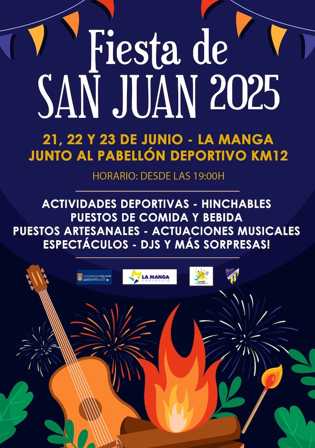 Colectivos y La Manga Consorcio organizan las 'Fiestas de San Juan 2025' desde el sábado 21 hasta la noche el lunes 23 junto al pabellón del kilómetro 12. El programa ofrece actividades deportivas hinchables, artesanía, música, etc.
