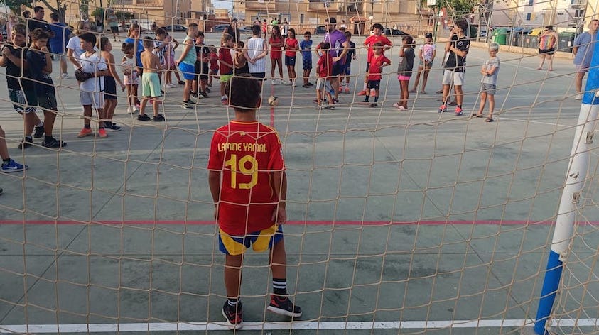 Este verano, según hemos observados en nuestras constantes rutas por los pueblos del municipio, las camisetas que lucen los chavales con los nombres de futbolistas como Messi, Ronaldo o MBappé están siendo superadas por las de un jugador de la selección española y del FC Barcelona, Lamine Yamal. La imagen está tomada en Islas Menores.