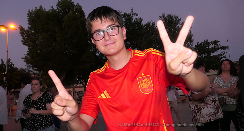 La selección española de fútbol disputa esta noche el título de campeón de la Eurocopa'24, lo que motiva que la glorieta de San Francisco vuelva a instalarse una pantalla gigante, al igual que se vivirá en grupo en Galifa, Islas Menores y otras poblaciones, como Los Nietos, donde coincidirán hispanos y británicos. Mientras, en Los Urrutias trasladan a otro día un espectáculo de fiestas que habían fijado para esta noche. En la foto, un joven aficionado cartagenero pronostica un 2-1 favorable a España.