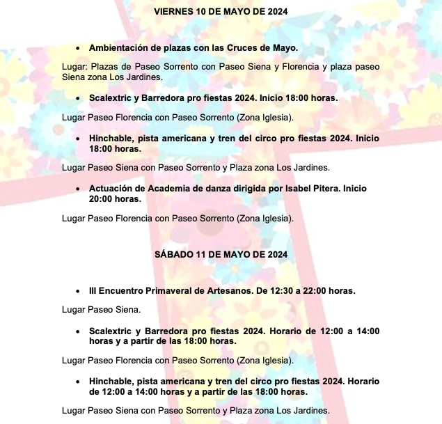 La edición de este año, que tendrá lugar del 10 al 12, abarca una jornada más que en 2023. La comisión de fiestas abrirá el programa con la cruz floreada en varias plazas, pues serán en diferentes enclaves de la barriada de Cartagena norte por donde actúen academias de danza, varios ‘djs’, la comparsa ‘Paraíso’ (foto adjunta), los grupos ‘Aires de la calle’, ‘Callejón del sastre’, ‘Nunca es tarde’, ‘Antuán Muñoz’ y ‘Duetto’, además de la tercera edición del encuentro primaveral de artesanos, entre otras propuestas.
