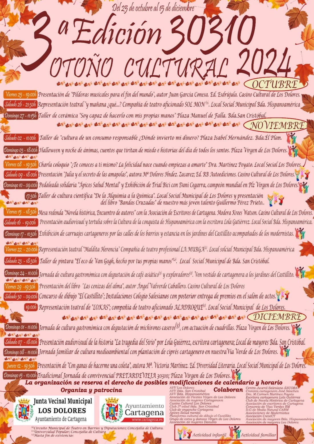 También destaca la variedad de escenarios, como el Casino de Los Dolores, los locales sociales y las plazas de las diferentes barriadas, la plaza Virgen de los Dolores, el colegio Salesianos y los jardines de Castillitos. 'Otoño cultural' surge a través de la Junta Vecinal Municipal de Los Dolores con la colaboración de las asociaciones de las tres barriadas mencionadas.