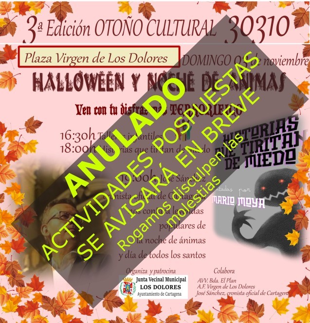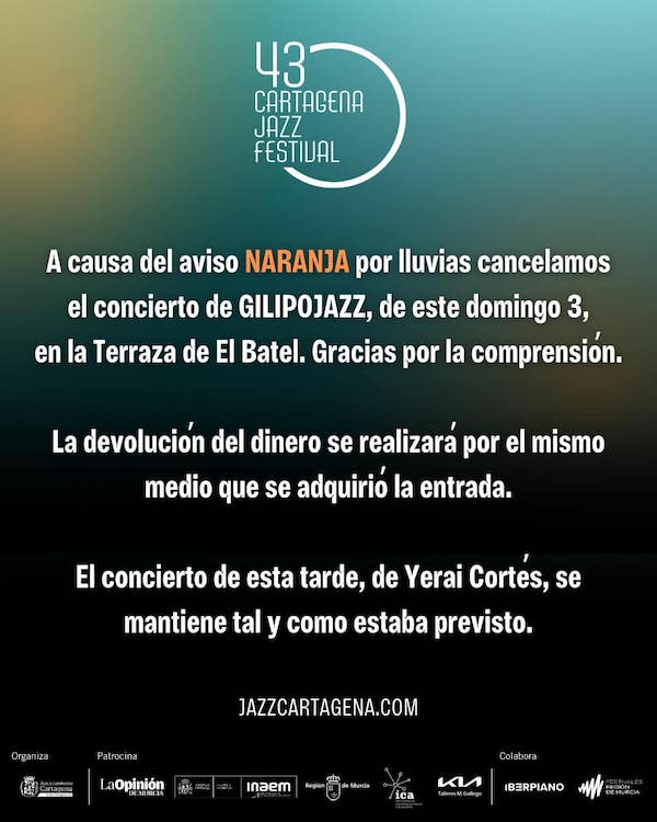 El '43 Cartagena Jazz Festival' anuncia, en base al aviso naranja por lluvias, la cancelación del concierto de Gilipojazz que se iba a celebrar hoy en a terraza del auditorio. Por su parte, la Junta Vecinal Municipal comunica que quedan pospuestas las actividades del 'Otoño cultural' programadas para la tarde de hoy.