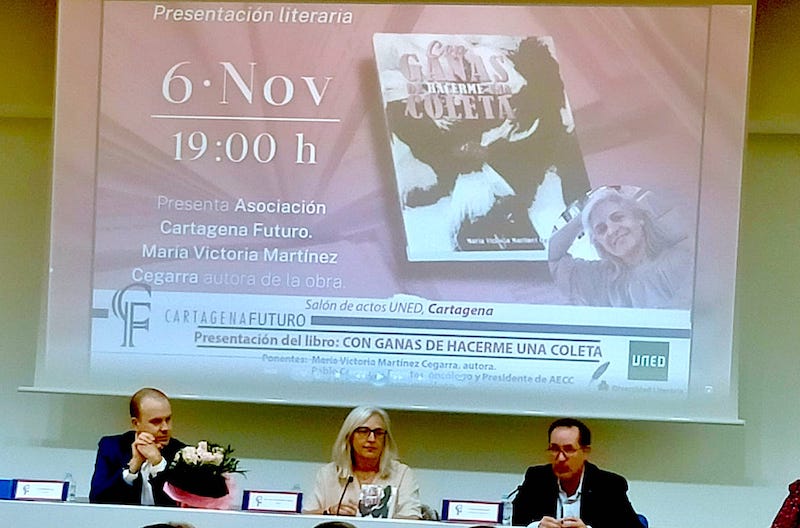La dolorense María Victoria Martínez Cegarra ha escrito 'Con ganas de hacerme una coleta', un libro autobiográfico en el que relata su lucha frente a un cáncer de pecho, desde el miedo inicial a cómo se va sintiendo durante el tratamiento. El acto de presentación fue organizado por la asociación 'Cartagena Futuro' en el salón de la UNED de Cartagena.