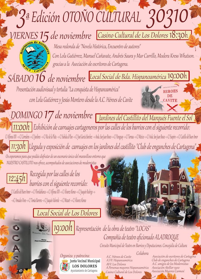 Una mesa redonda de autores de novela histórica abre esta tarde la programación en el Casino Cultural de los Dolores, mientras que el local social de Hispanoamérica acogerá el sábado el audiovisual 'La conquista de Hispanoamérica', con posterior tertulia. El domingo hay exhibición de carruaje por los barrios de Cartagena Norte, con llegada al Castillito. Por la tarde, teatro en el local social de la calle de Alfonso XIII.