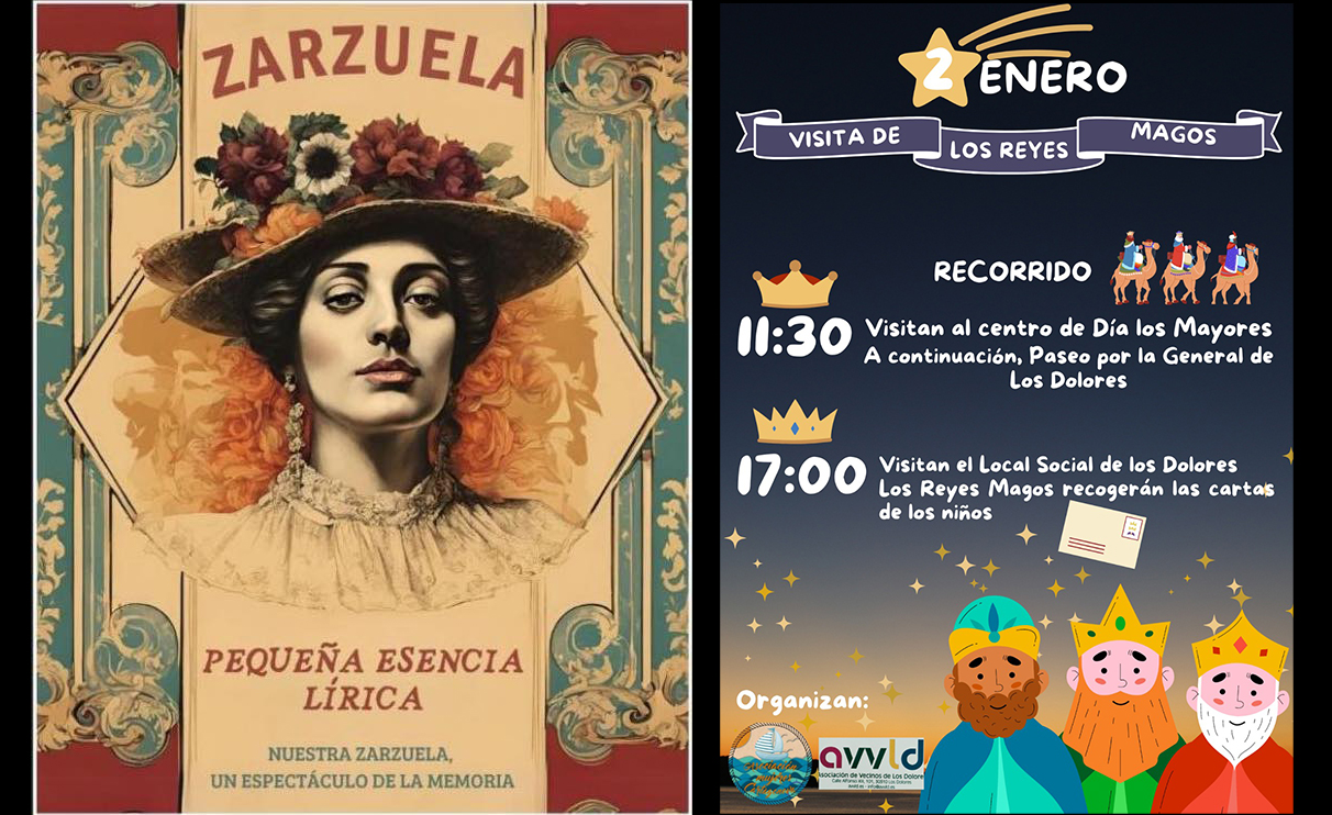 El espectáculo 'Pequeña esencia lírica', a cargo de la compañía 'Representainment', que comenzará a las 12 horas, pone el broche al programa el circuito de teatro organizado por el Ayuntamiento de Cartagena, que se ha desarrollado con más de setenta representaciones, entre mayo y este último día del año. Ek viernes 3 de enero, a partir de las 17.30 horas, hay lotería familiar en el local social de la Asociación de Vecinos de Los Dolores, al igual que el sábado día 4, pero en esta ocasión con baile a partir de las 18 horas.