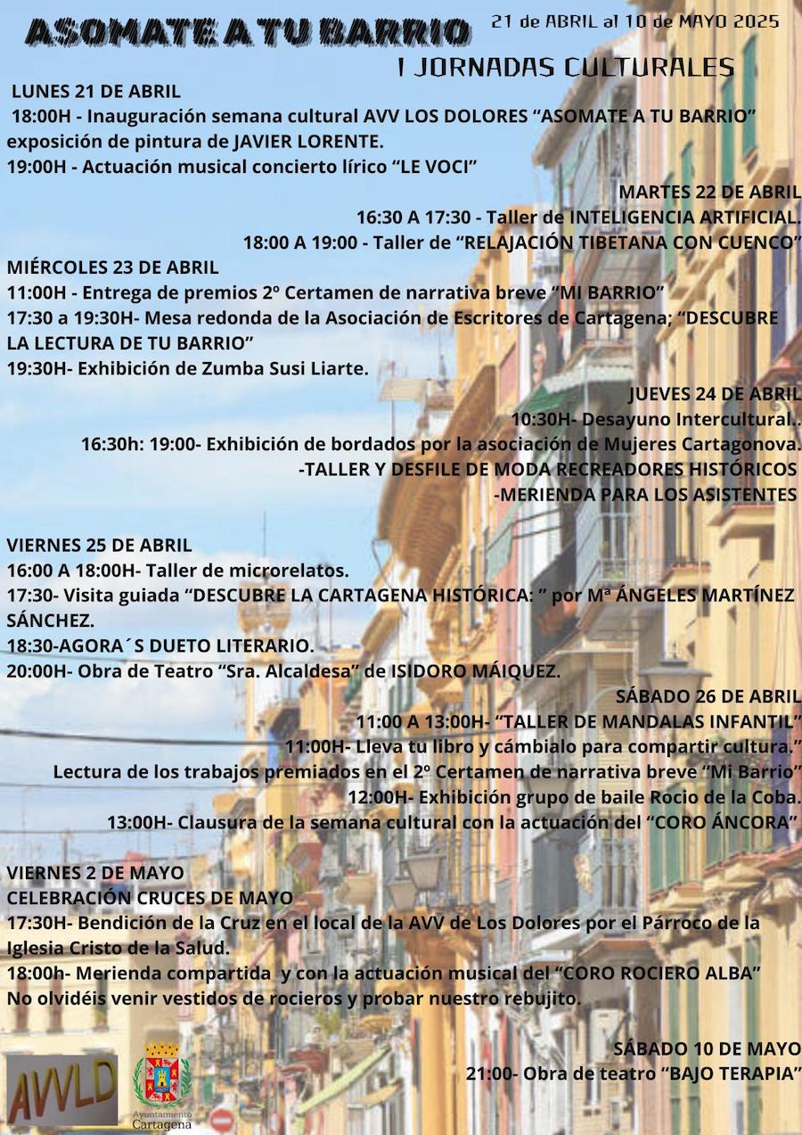 La asociación de vecinos ha estrenado un nuevo formato de días en los que ofrece diversas propuestas en torno a la cultura. Se comenzó el lunes con una exposición de pintura del artista galileo Javier Lornete y con el concierto lírico de 'Le Voci'. Hoy se entregan los premios del certamen de narrativa breve 'Mi barrio', hay una mesa redonda de la asociación de escritores y culmina la tarde con una exhición de zumba. El final del viernes se vinculará al inicio de las cruces de mayo.