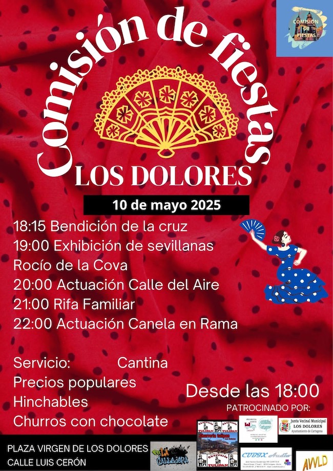 La emblemática plaza de la Virgen de los Dolores acogerá el 10 de mayo, durante la tarde y la noche, la celebración de la floreada fiesta con sevillanas, música en directo, cantina, rifa familiar, etc. Organiza la comisión de las fiestas de septiembre del populoso barrio dolorense.