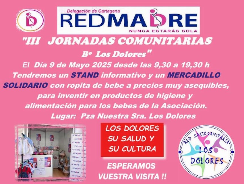 La Fundación REDMADRE estará presente en las ‘III Jornadas Comunitarias del Barrio de Los Dolores’ con un stand informativo y un mercadillo solidario. En el mismo, ofrecerá ropita de bebé a precios muy asequibles cuya recaudación irá destinada a la compra de productos de higiene y alimentación.