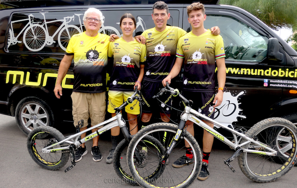 El dolorense Daniel Cegarra fue dos veces campeón del mundo de trialbici y diez de España. Su hijo, del mismo nombre y a quien se ve a su izquierda, ya ha logrado varios oros mundiales en categorías de base y ahora ha iniciado su trayectoria en la élite. En la foto posan con la hermana de este último, Paola, también practicante, y el abuelo Paco, quien también está enrolado en el equipo.