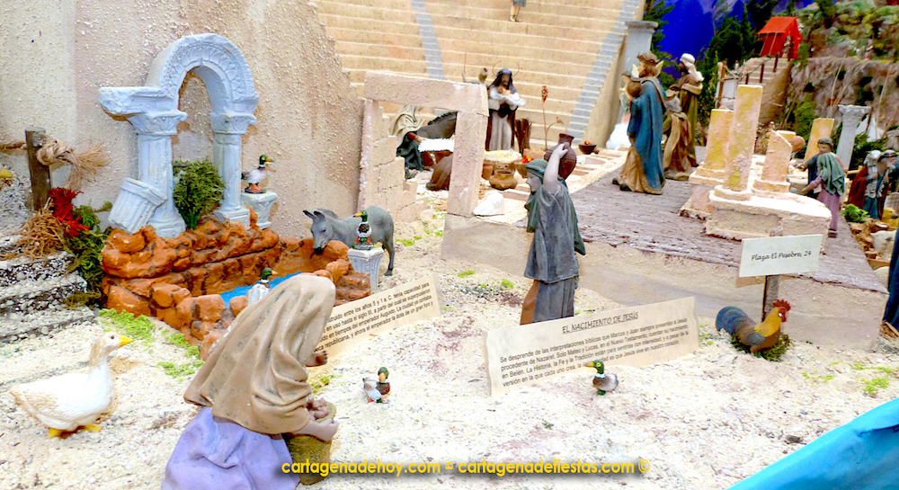 Tras la pertinente bendición por parte del párroco, vecinos y visitantes han podido acceder al interior de las carpas para contemplar un montaje que cada año es diferente. Además de 25 nuevas figuras adquiridas a una empresa belenista de Valencia, figuran importantes novedades como es la réplica del Teatro Romano de Cartagena, en el que se ha ubicado el nacimiento de Jesús, estando franqueado en ambos laterales por el monte de la Concepción (con la Linterna incluida y encendida) y el volcán Vesubio en erupción. Este último era una idea de hace unos años que en el actual se ha materializado, siendo un guiño también para el volcán de La Palma canaria.
