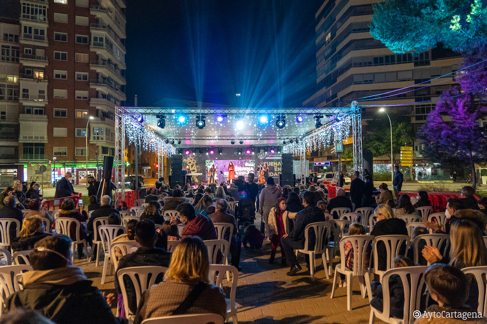 La plaza de España se convierte en un punto neurálgico de la Navidad tras comenzar allí las actividades navideñas programadas con la actuación de Route 33 con Lydia Martín + Amigos “Cartagena Sueña en Navidad”.