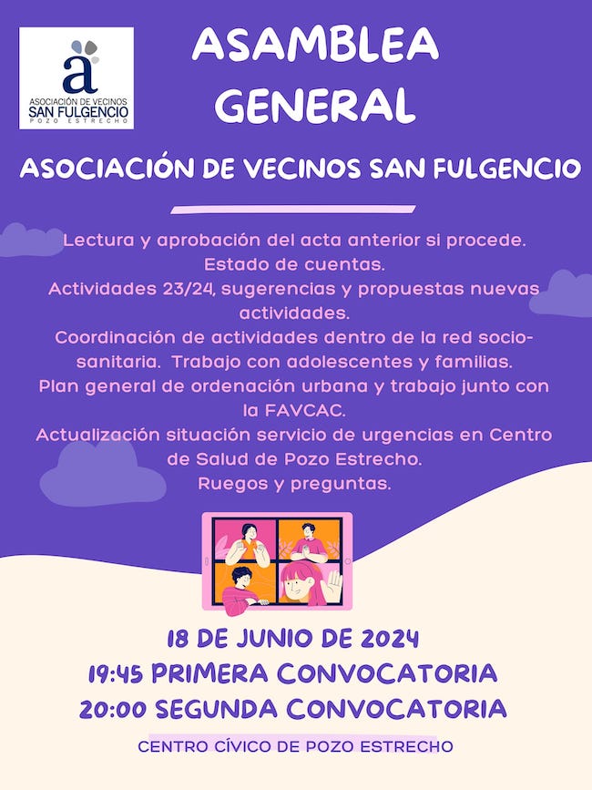 La Asociación de Vecinos ‘San Fulgencio’ comunica que este martes, a partir de las 19.45 horas en primera convocatoria, celebrará en el centro cívico asamblea de socios, donde, entre otros temas, se abordarán las actividades a llevar a cabo este año, el nuevo plan general de ordenación urbana elaborado por el ayuntamiento y la situación del servicio de urgencias del centro de salud.