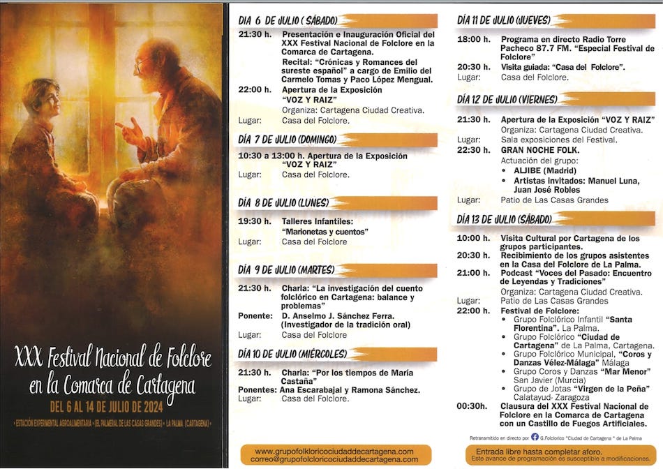 Un año más, el Grupo Folclórico Ciudad de Cartagena de La Palma celebra su Festival Nacional del Folclore que, en esta trigésima edición, está compuesto por múltiples actividades. De entre todas ellas, cinco se han centrado en recuperar el cuento tradicional que nuestros abuelos contaban a sus nietos en el campo de Cartagena.