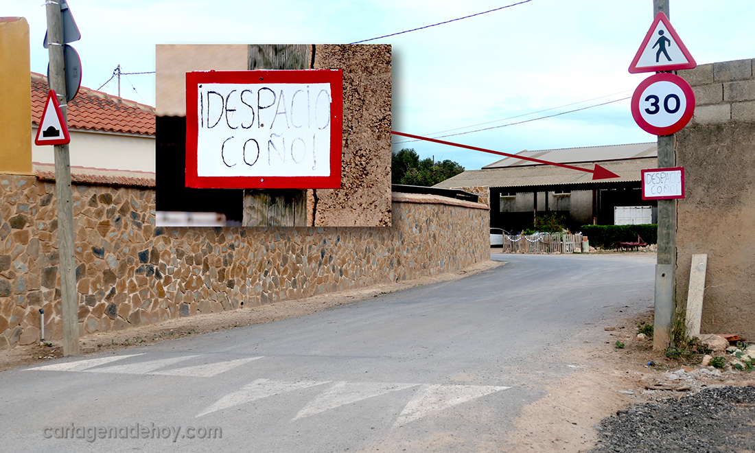 Uno de los caminos que salen de la carretera de La Aljorra hacia El Palmero tiene varias viviendas cerca de la entrada y, pese a la colocación de resaltes, parece ser que hay vehículos que pasan con excesiva velocidad, para riesgo de los residentes, quienes han optado por pedir (en ambos sentidos) de forma muy directa un tránsito más lento.