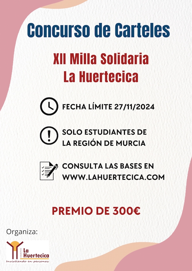 La asociación abre la convocatoria del segundo concurso para la imagen oficial que anunciará la décimo segunda 'Milla solidaria', que se celebrará en febrero de 2025 con el lema 'Entrena tu conciencia'. La convocatoria va dirigida a cualquier estudiante, tanto a título individual como colectivo, con un mínimo de edad de 14 años, vinculado a un centro educativo de la Región de Murcia durante el presente curso escolar 2024/25.