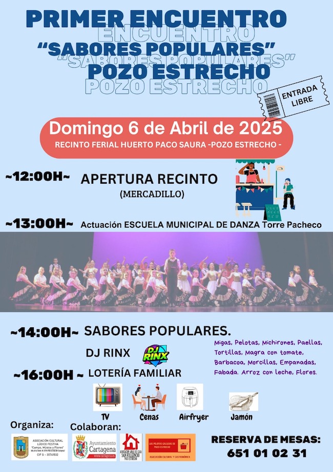 Migas, pelotas, michirones, arroces, tortilals, magra con tomate, morcillas, empanadas, arroz con leche, flores y otros productos de los campos de Cartagena confluirán con un mecadillo y actuaciones musicales que tendrán lugar el 6 de abril en el recito ferial Huerto Paco Saura de Pozo Estrecho, en una novedosa iniciativa organizada por la asociación lúdico festiva 'Campo, música y flores'.
