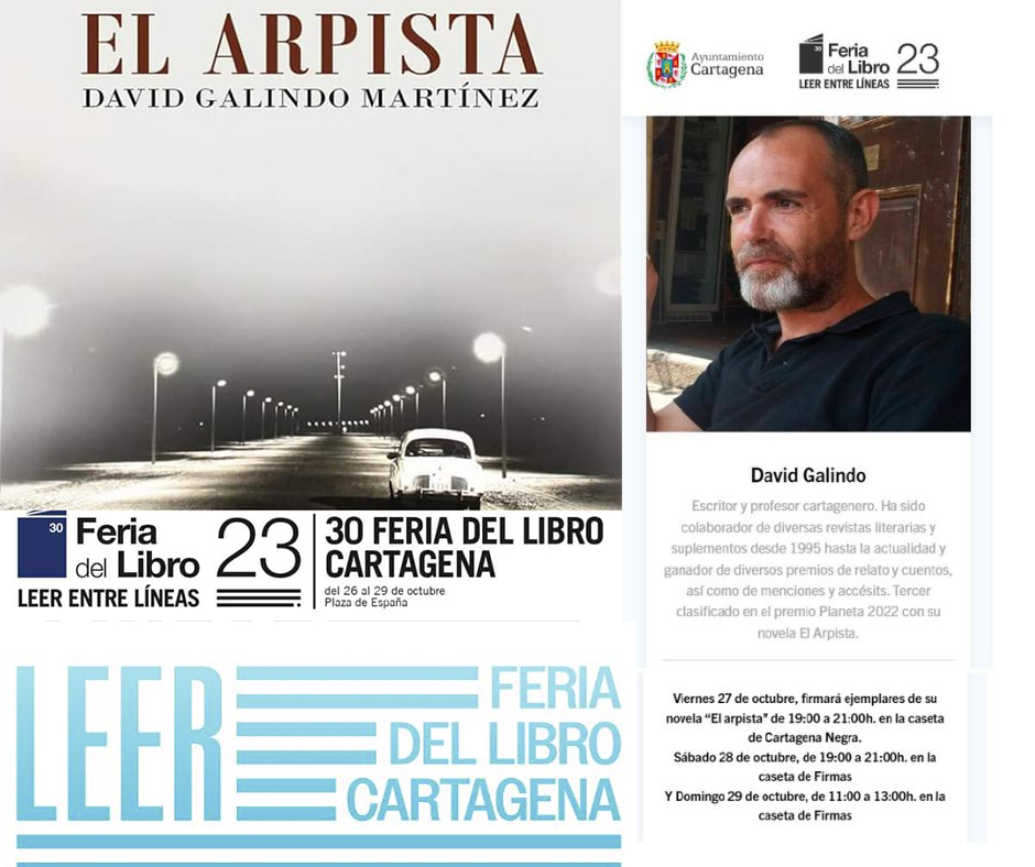 David Galindo, autor de El Arpista, publicada por Cosecha Negra Ediciones, estará firmando ejemplares en la nueva edición de la Feria del Libro de Cartagena, organizada por el Ayuntamiento de la ciudad y que se celebra del 26 al 29 de octubre con el lema Leer entre líneas.