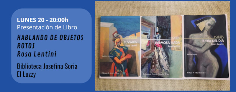 El programa de la Concejalía de Cultura Leer, Pensar, Imaginar, presenta este lunes 20 de mayo la trilogía ‘Hablando de objetos rotos’, de Rosa Lentini. Será a las 20:00 horas, en la Biblioteca Josefina Soria del Centro Cultural Ramón Alonso Luzzy.