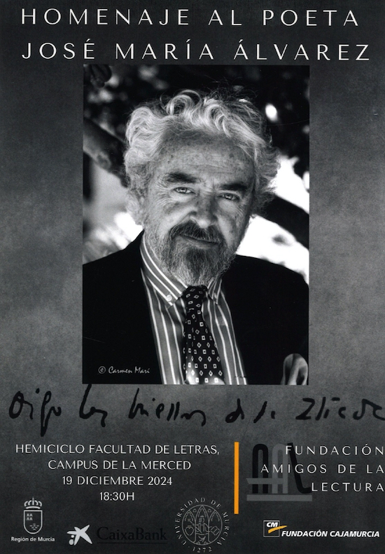 El hemiciclo de la Facultad de Letras de la Universidad de Murcia ha acogido un tributo al poeta cartagenero José María Álvarez, recientemente fallecido. En el acto, organizado por la 'Fundación amigos de la lectura', tuvo lugar una mesa redonda donde los amigos del 'Novísimo', pudieron rendir homenaje a la figura del poeta y a su amplio legado.