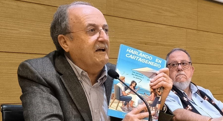 El caricaturista José Francisco Martínez López presentó su libro 'Hablando en cartagenero', una obra en la que plasma más de tres mil palabras del habla peculiar de los habitantes de esta tierra, junto a más de quinientos dibujos realizados por él.