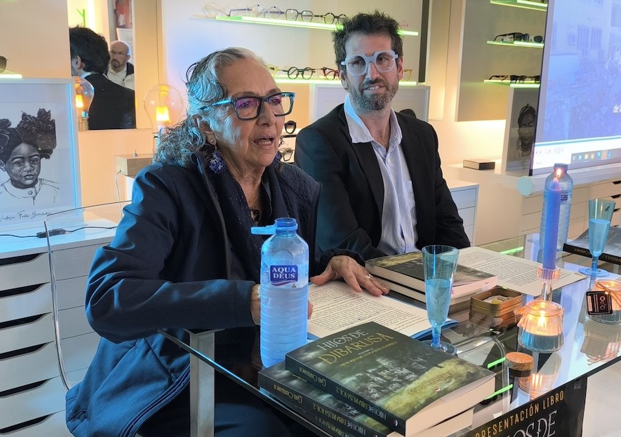 El escritor presentó en Cartagena su libro 'Hijos de Dibarusa: Memorias de un planeta colérico', una obra en la que expone un mundo deshumanizado. En la foto se le observa junto a Ana Escabajal y (de pie) a la presidenta de la asociación cultural 'Cartagena ciudad creativa'.