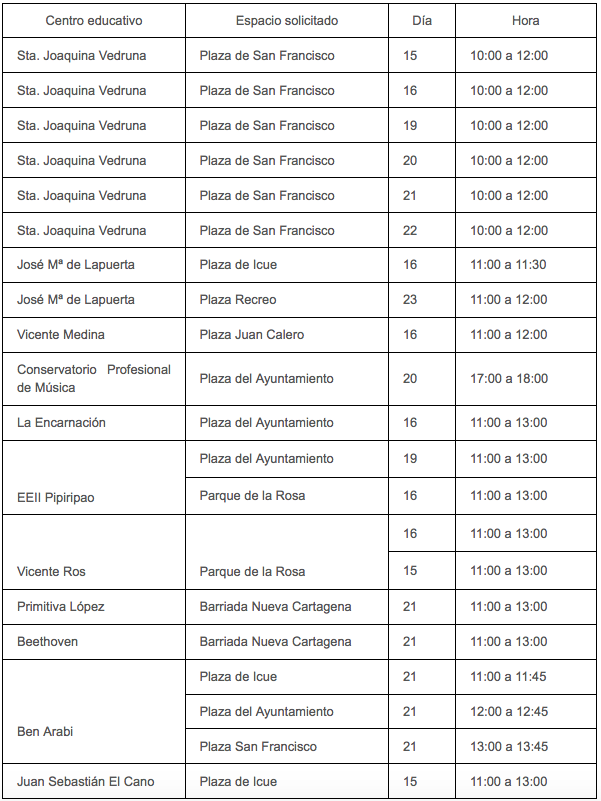“Con esta actividad, la música y el trabajo que se hace en las aulas sale de los centros a los espacios públicos de Cartagena, para que los escolares puedan ofrecer sus recitales de Navidad en nuestras plazas y calles”, ha explicado la concejala de Educación, Irene Ruiz. En concreto, los recitales van a tener lugar en las plazas San Francisco, del Icue, Recreo, Juan Calero y del Ayuntamiento, así como en el Parque de la Rosa y la Barriada Nueva Cartagena.
