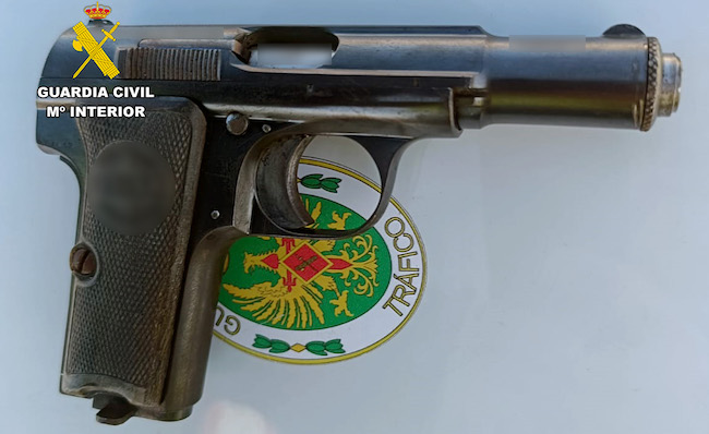 Al sospechar que los ocupantes del vehículo detectado en el control de velocidad podrían haberse desprendido de algún otro objeto antes de detener su marcha por completo, los especialistas de la Agrupación de Tráfico de la Benemérita realizaron una inspección visual en el arcén y hallaron una pistola con su correspondiente cargador municionado y dispuesta para accionarse.
