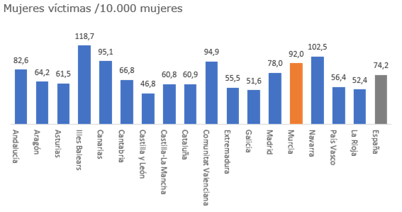 Las cifras del año 2024 reflejan un 9,6% menos presentadas, siendo la media de 22 diarias, pero la Región de Murcia está en el quinto lugar entre las comunidades autónomas con mayor tasa de víctimas por cada 10.000 mujeres. Seis de cada cien denunciantes se acogieron a la dispensa del deber de declarar en el juicio contra el presunto agresor, un porcentaje inferior a la media nacional, que asciende hasta el 10%