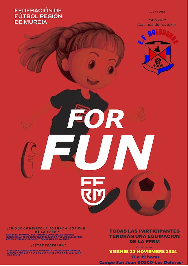 La Federación de Fútbol de la Región de Murcia convoca a chicas de entre 5 y 12 año de edad para esta tarde en el campo San Juan Bosco de Salesianos (Hispanoamérica-Los Dolores) en la iniciativa 'For Fun', cuya traducción al idioma español es 'Por diversión'.